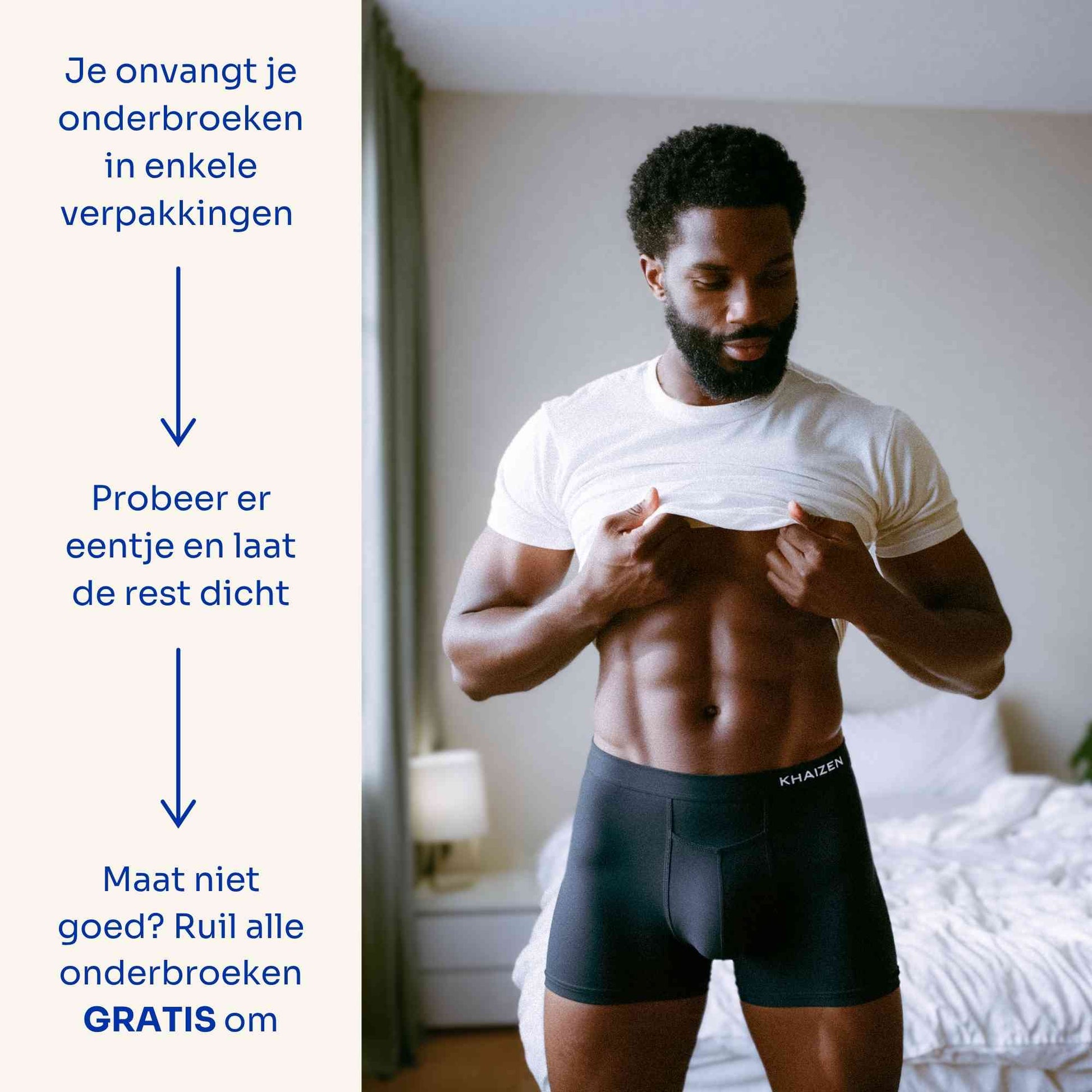 De eerste onderbroek valt onder onze Maatgarantie service. We raden aan om eerst één stuk te passen en de overige artikelen ongeopend te laten met de blauwe zegel intact.